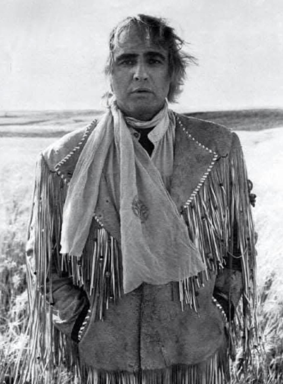 في هذا الفيلم تحديدا، الذي يلعب فيه دور “صائد جوائز” لا تنقصه الشخصية الاجرامية، بعكس سارقي الخيول والقطارات الذين يطاردهم، والذين لا تنقصهم الطفولية والبراءة والتوق الى الحب، يخرج الينا براندو بشخصية خلاسية بين عنف الرجل ورقة الأنثى وعذوبتها. يصعب التخيل بوجود شخصية مثل هذه ترتدي ملابس الجدة الوديعة، لكي تحرق بيتا وتنحر عنقا وتفقأ عينا بسكين دوّرا كأنه حربة. ستقول الجدة لنفسها:” آه أيتها الجدة، عليك ان ترتاحي الآن”، ثم تحمل “كلارينيت” وتغني أغنية حب للخيل التي تحبها:” أنت أكثر من أحببت في العالم وليس كمثل الخيل الثانية الخائنة الفاسقة”. بشال رقيق مزخرف بالورود، وسترة لا تنقصها “شراريب”، وطريقة كلام لا يعوزها الدلع، وشعر أشقر متطاير، يدهشنا براندو مرة أخرى باختراع لم يسبقه اليه أحد لشكل وشخصية “صائد جوائز” في فيلم “ويسترن”. هذا الالتباس وتلك الخلاسية ميزت الرجل، لا في أدواره السينمائية، ولكن في حياته ومواقفه وتصريحاته، وهذا أحد اسرار جاذبيته، اذ هو غامض وعصي على الفهم.